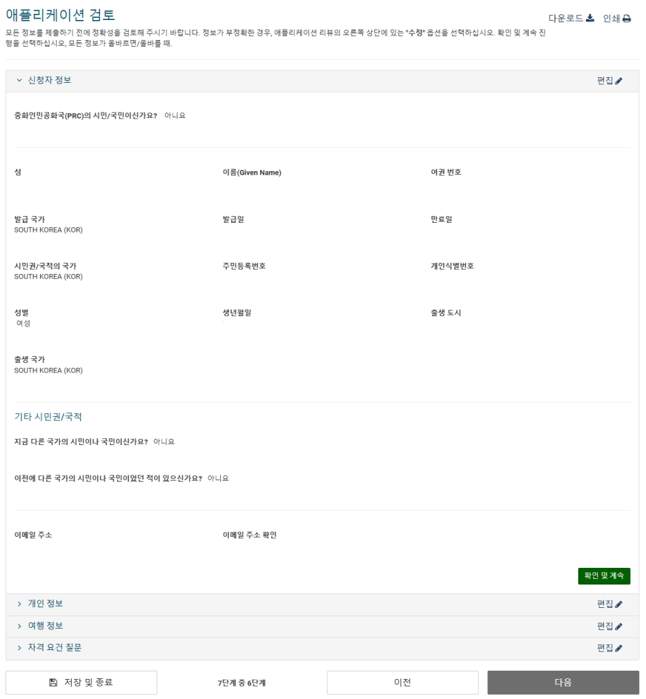 성, 이름, 여권번호, 발급국가/일자, 만료일, 시민권/국적의 국가, 생년월일, 성별, 출생지, 주민등록번호 정보 입력