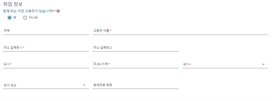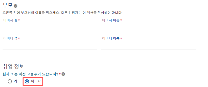 직업 정보 "아니오" 선택해도 신청에 문제 없음. (고용 정보 입력 귀찮다면 생략 가능)