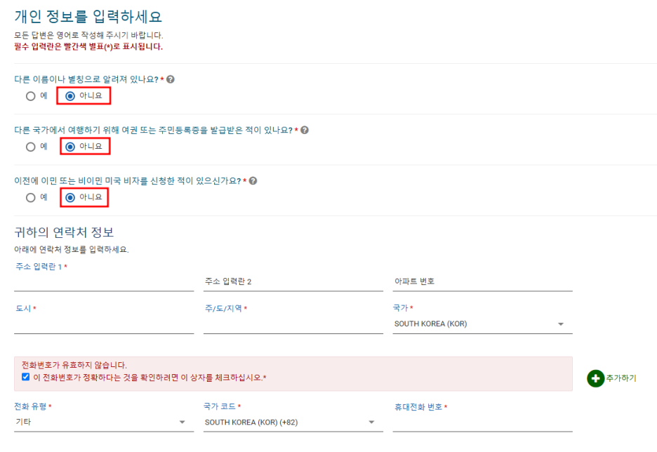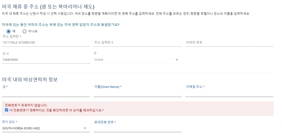 미국 체류 주소는 선택하면 됨. (우리 가족은 한 숙소에만 머물렀기에 "예"를 선택)
