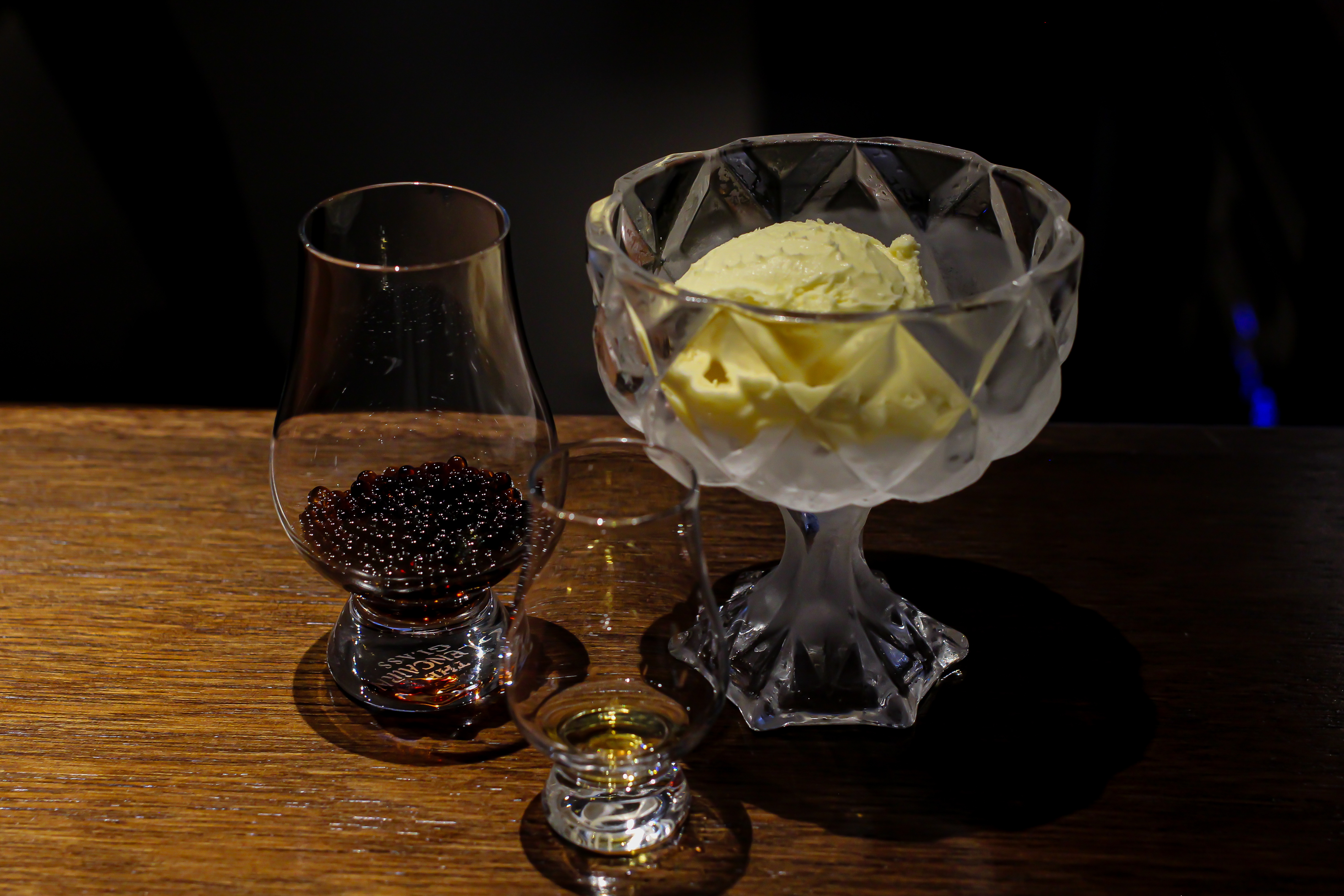 더치 커피를 분자요리 방식으로 캐비어 모양을 만들고 바닐라 아이스크림과 소량의 위스키를 곁들여 먹으면 되는 메뉴에요.